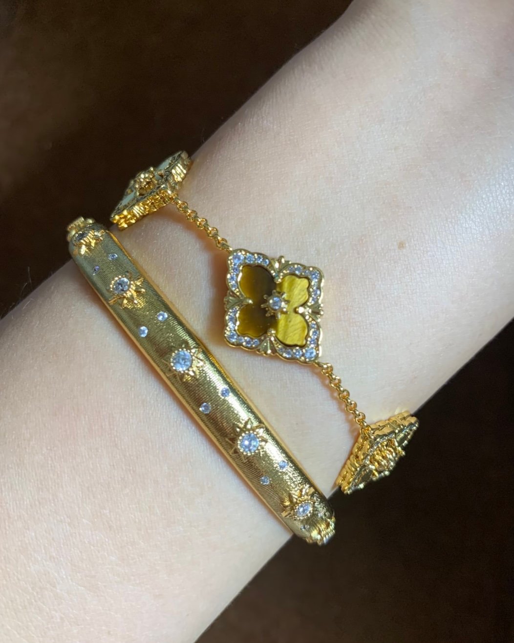 Buccellati-style Four-Leaf Clover/Five-Petal Tiger Eye Double-Sided Bracelet