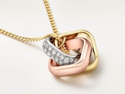 Original price was: $199.00.$99.00Current price is: $99.00.Trinity Pillow-Shaped Pendant, Half-Paved With Diamonds, Tricolor Gold
